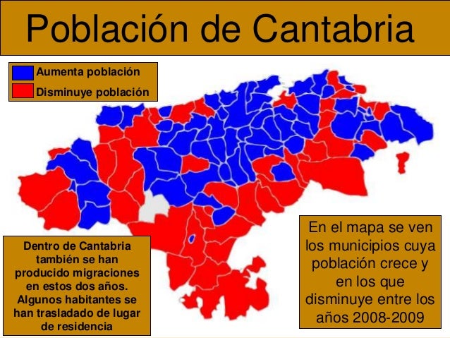 La población se concentra en la zona costera, donde se localizan las principales ciudades: Santander, Torrelavega, Laredo, Santoña, Castro-Urdiales...En el interior, menos poblado, destaca Reinosa.